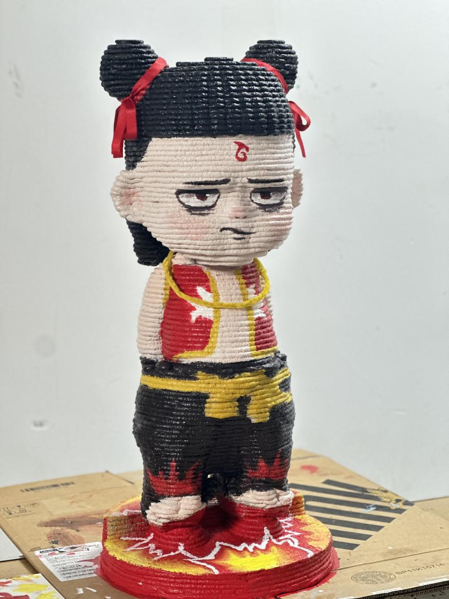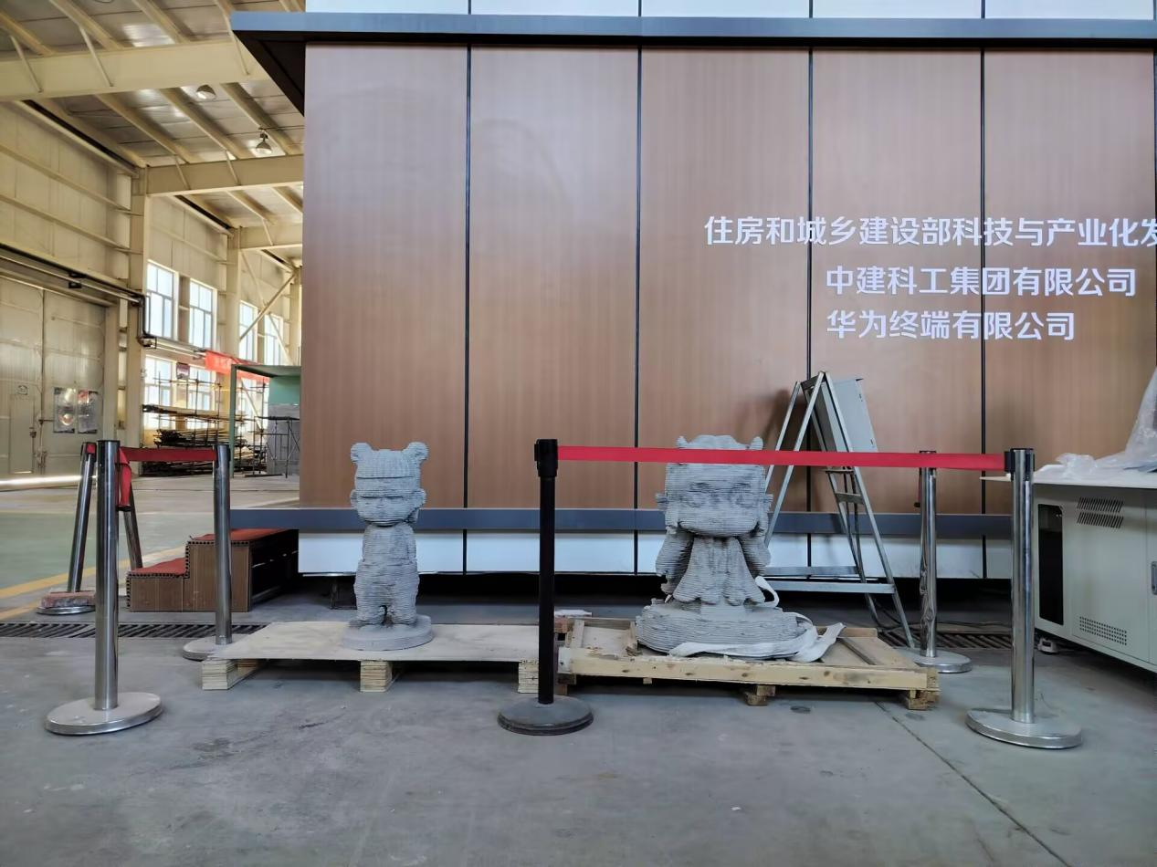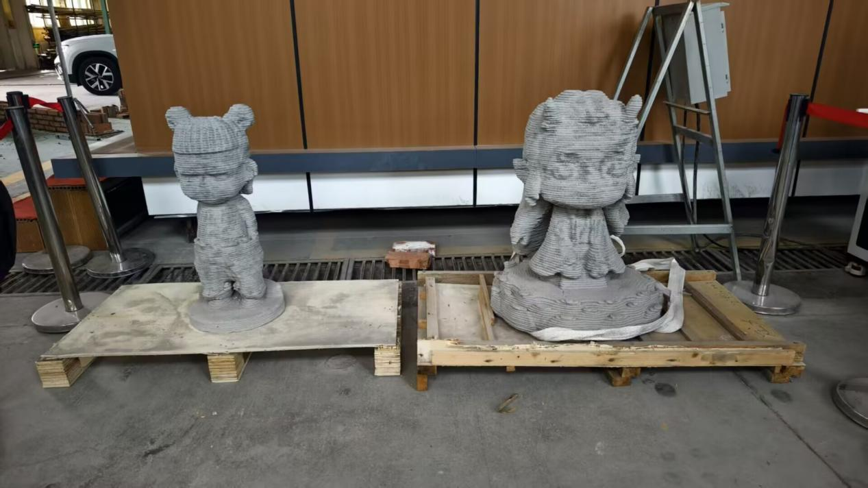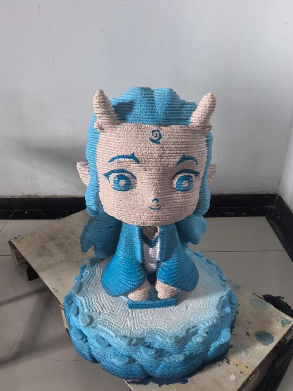 在技术实现阶段,建筑工程学院智能建造团队采用水泥材料,通过大型3D打印机精准输出雕塑基底。打印成品不仅完美还原了设计稿中哪吒桀骜不驯的动态造型,以及Q版龙王三太子的可爱神态也清晰可见。
