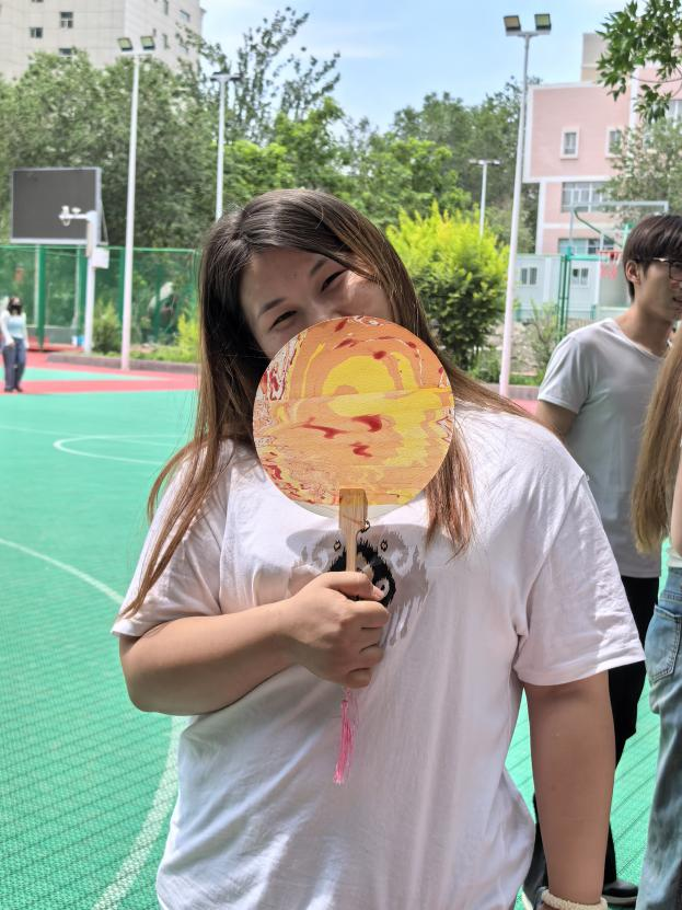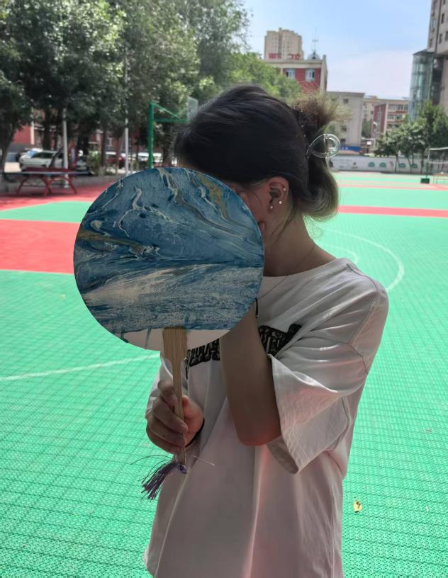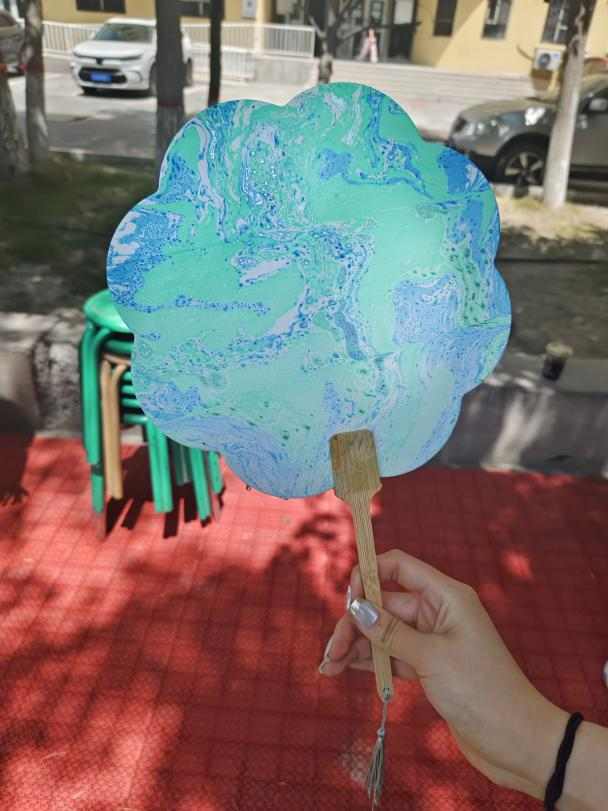 在此次漆扇体验活动前,建筑规划与设计学院辅导员闵婉婷老师带领同学们追溯了漆扇穿越千年的历史脉络,详细介绍了漆扇的制作方法,为同学们开启了一场融合传统美学与设计智慧的探索之旅。随后同学们俯身凝神,小心翼翼将彩墨滴入水中,颜料随即于水面如云霞般舒展、交融、沉浮。随后,大家屏息凝神,将自己选定的素白扇面徐徐浸入水中,奇妙如魔法般瞬间呈现。颜料在水面自由游走、碰撞、附着,每一次浸染都蕴含偶然天成之美,每一把扇子都是颜料与水流共同书写的孤本杰作。当作品缓缓出水,扇面上晕染开不可复制的纹理与色彩时,操场上惊叹与欢呼此起彼伏。这不仅是一次扇面制作,更是自然之力与人文心意在方寸之间的惊艳对话,水痕纹理中蕴藏无限空间美学遐思。