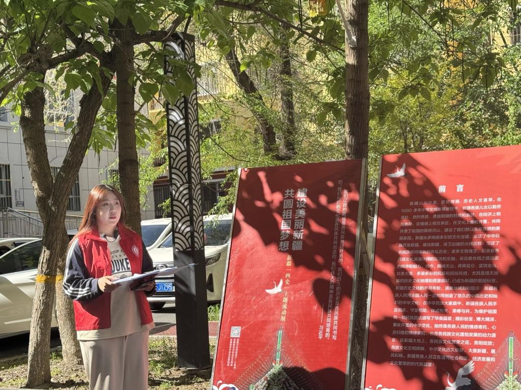 讲解员们以专业的知识和饱满的热情,对展板内容进行详细讲解。他们从“新疆是中国领土不可分割的一部分、新疆各民族是中华民族血脉相连的家庭成员、新疆各民族文化是中华文化的组成部分”等方面娓娓道来,并结合新疆从西汉设郡到新时代发展的历史脉络,通过图文展板生动展示了新疆在党的领导下实现社会稳定、长治久安的历程